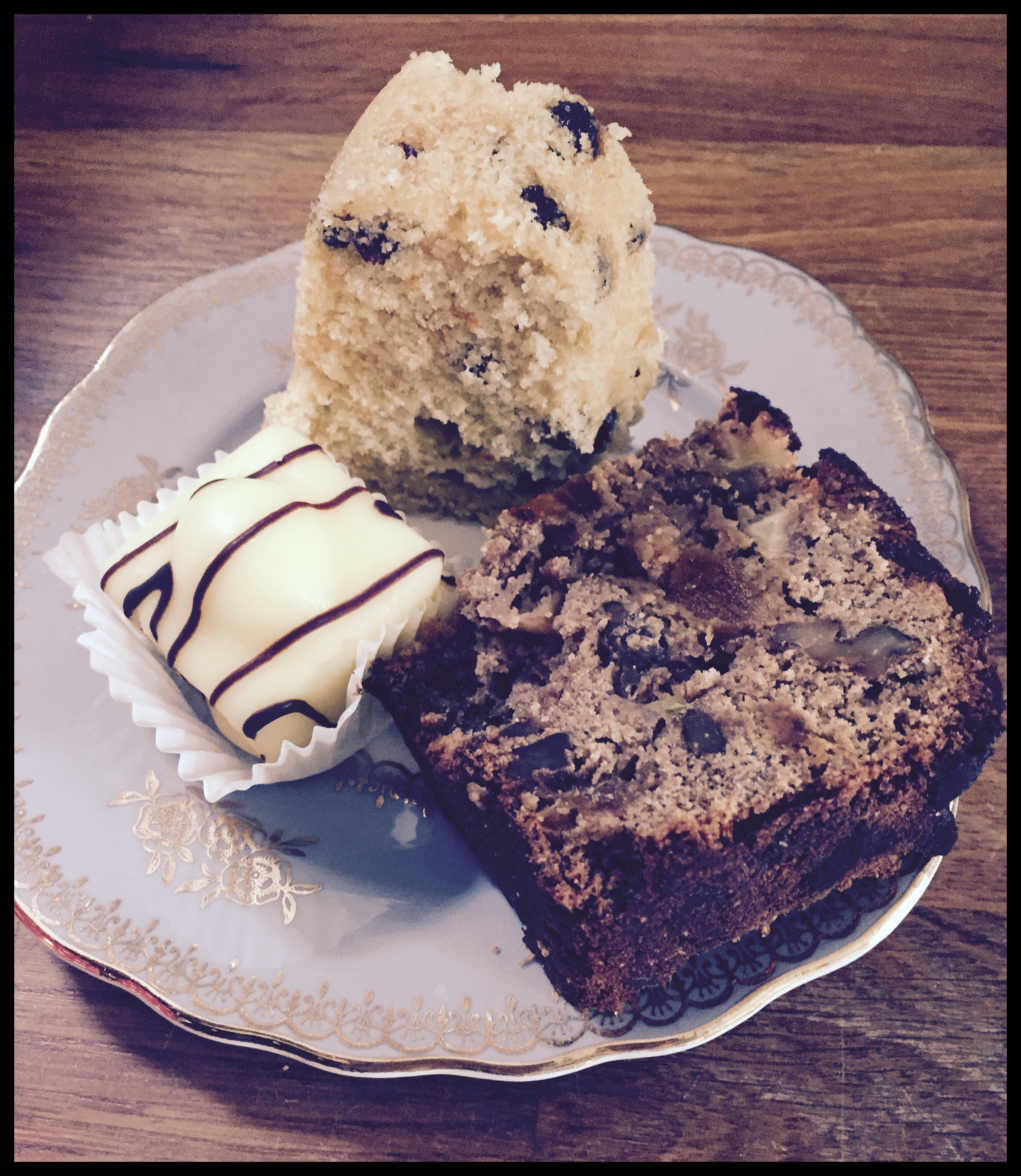 My lovely friends provided French Fancies, Apple, Apricot and Walnut Loaf, and Chocolate Eclairs. Worries about not having enough food to go round were unfounded.