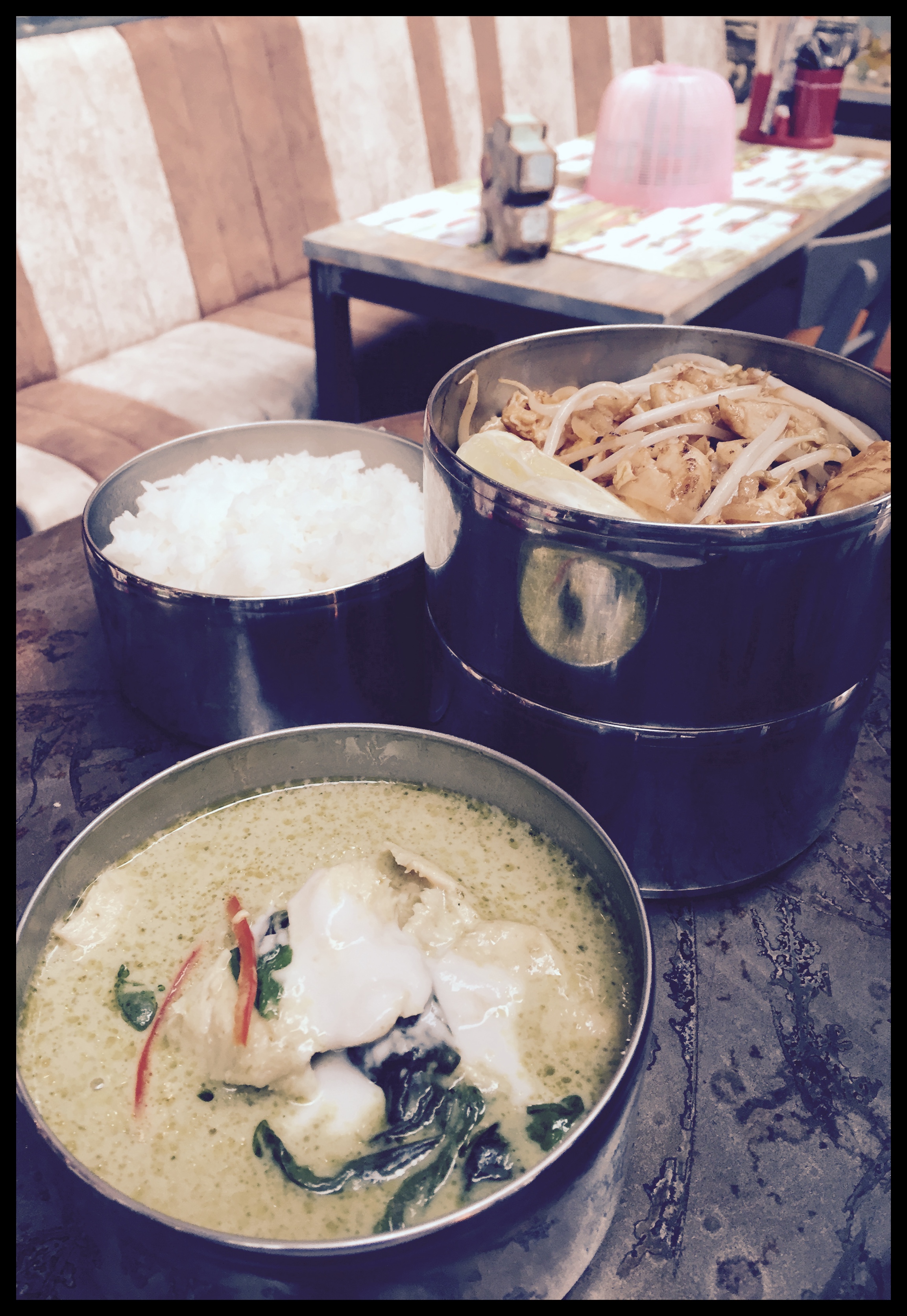 The Pinto Thai included our mutual favourite dishes, Green Curry and Pad Thai, as well as vegetable stir fry and Jasmine rice. It arrived at our table in what I can only think to describe as a metal stacking lunch box, although I suspect it does have a technical name that escapes me.