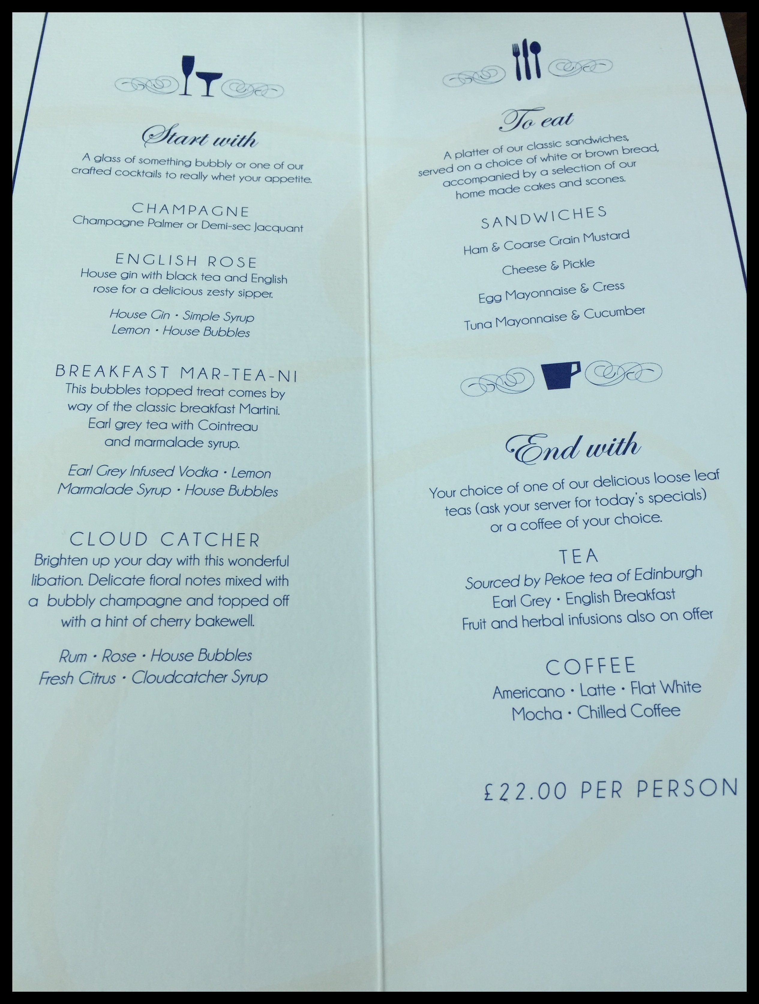 The menu, as is typical of Afternoon Tea, promised a “platter of our classic sandwiches…accompanied by a selection of our home made cakes and scones.” For £22.00 you are also treated to champagne or a cocktail, and a pot of tea or a coffee.