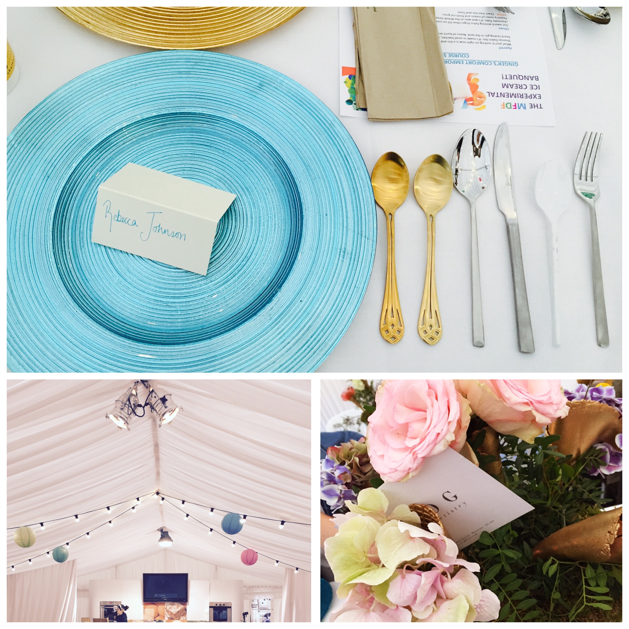 The meal was served in the festival hub in Albert Square, which had been decked out in pretty lights for the occasion. The tables were dressed with ice cream themed flower arrangements and our places had clearly been set for a feast.
