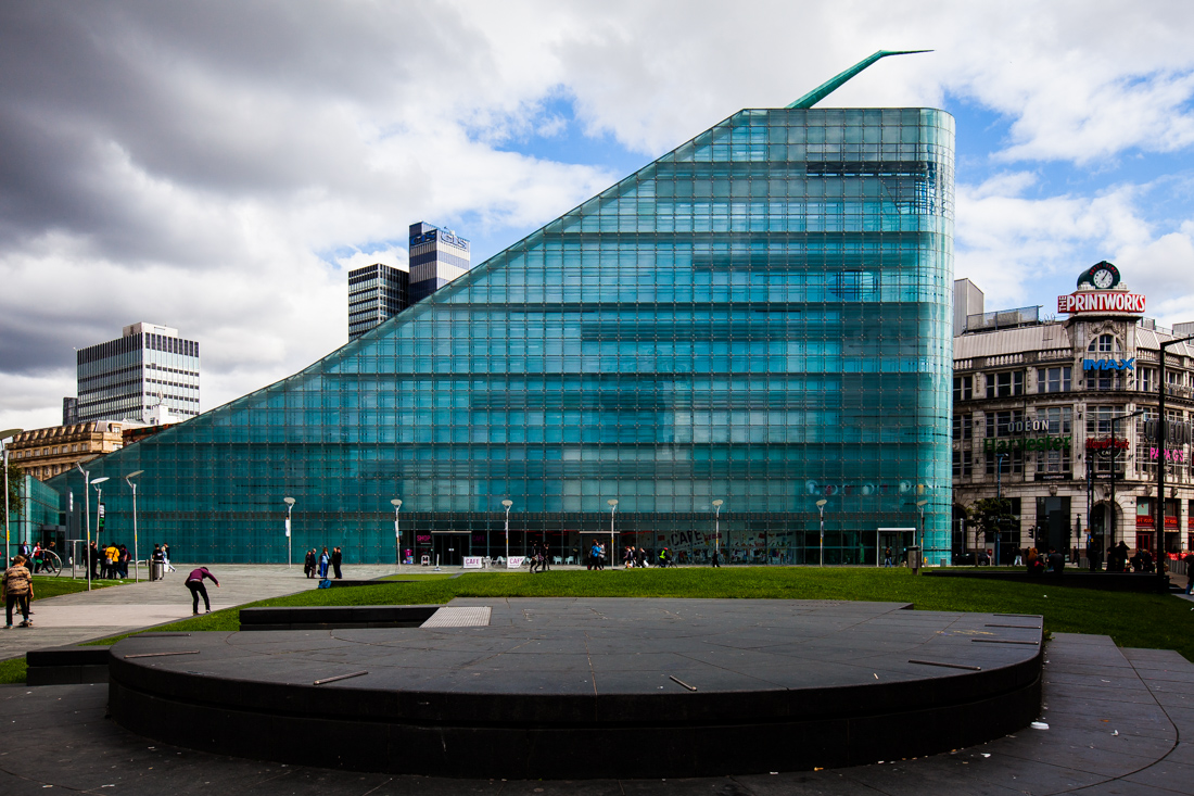 We carried on past Selfridges and stopped to contemplate the Oyster Bar and Manchester Cathedral behind. I always feel that Manchester has a pleasing blend of contemporary and modern architecture and I love to see the older buildings being refurbished and repurposed as much as I appreciate the beauty of the sky reflected in the many glass buildings that form Manchester’s skyline today.