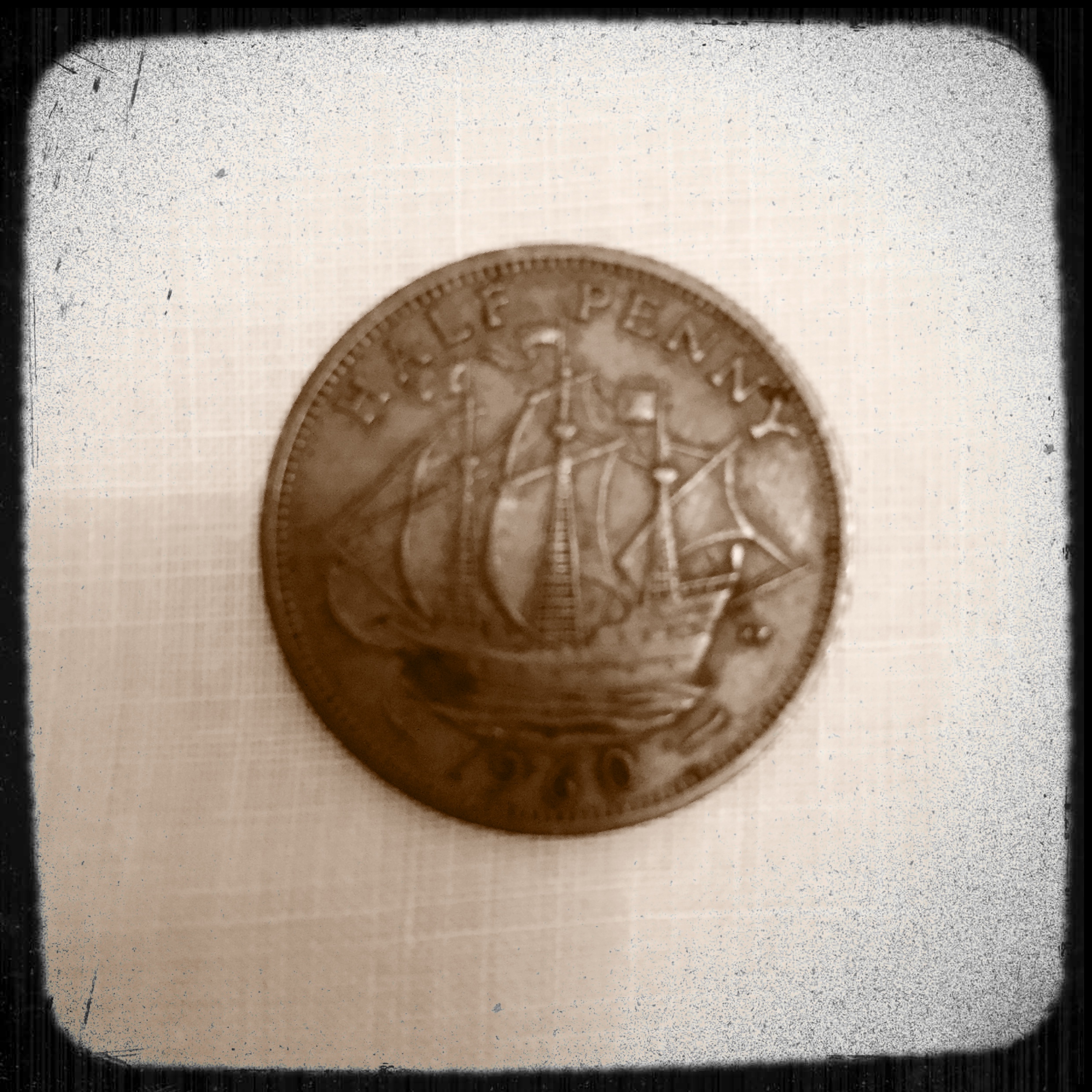 This was my bargain of the day, complete with half penny from 1960 – I like to think it was left in there by it’s previous owner, and wonder whether it helps to date the bag.