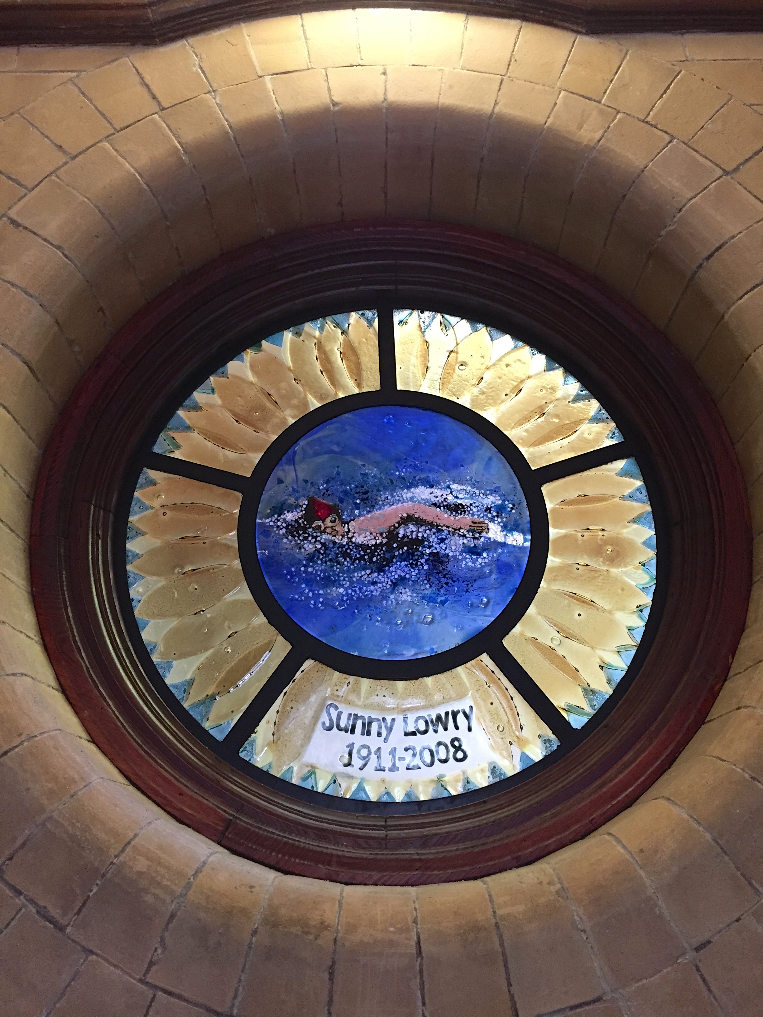 Sunny Lowry, the fifth British woman to swim the English Channel, began her swimming career at Victoria Baths and is remembered in commemorative stained glass.